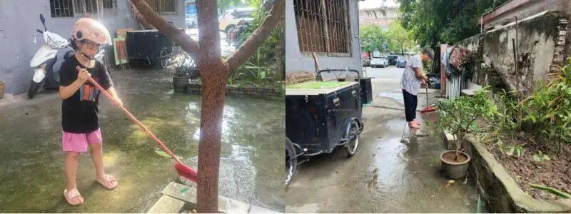 在江海区礼乐街道,台风过后的积水洼地旁,7岁半的陈梓晴握着一把比她还高的扫把,踮着脚尖,一点点将积水扫向排水沟。原来,她在学校上过爱国卫生知识课,知道积水会孳生蚊虫。看到外婆家瓜棚的积水后,她不等招呼,扛着扫把冲了出去,裤脚湿了也毫不在意。孩子的劲头感染了全家人,其舅舅、舅妈、外婆和闻讯而来的志愿者一齐动手,原本预计1小时的活儿半小时就完成了。