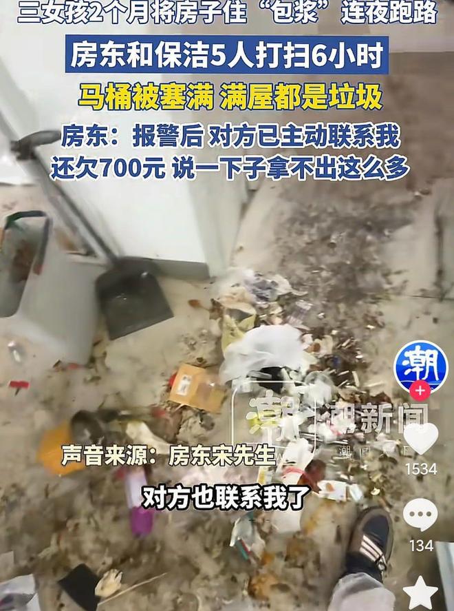 这三个女租客搬走以后,房东自己找了5个人,打扫了整整6个小时,毫不夸张的说,直接吐了两个小时。房间里的抽水马桶也堵住了,然后被他们直接用猫砂给盖住了,中间他们就去别的地方上卫生间。